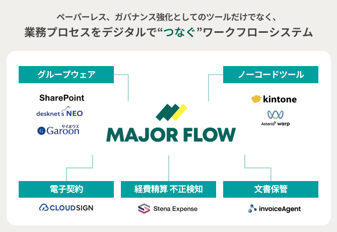 MAJOR FLOWでは、つながるワークフローをコンセプトとしており、ICカードやコーポレートカード連携、AIによるOCRや不正経費の自動検知、電子契約といった多くのサービスと連携が可能です。部門でバラバラに導入したサービスをMAJOR FLOWを中心として、稟議内容や契約書をシームレスにつなぎます。
