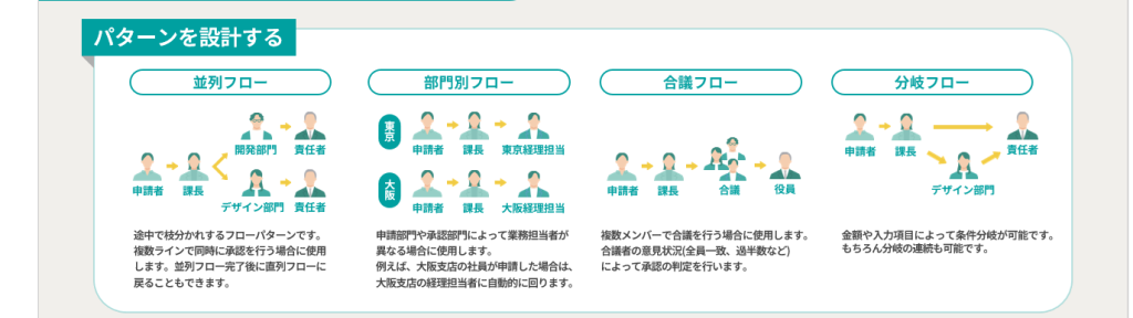 ・柔軟な承認ルート設定…部門ごとに異なる承認ルールや複雑なフローにも対応可能です。